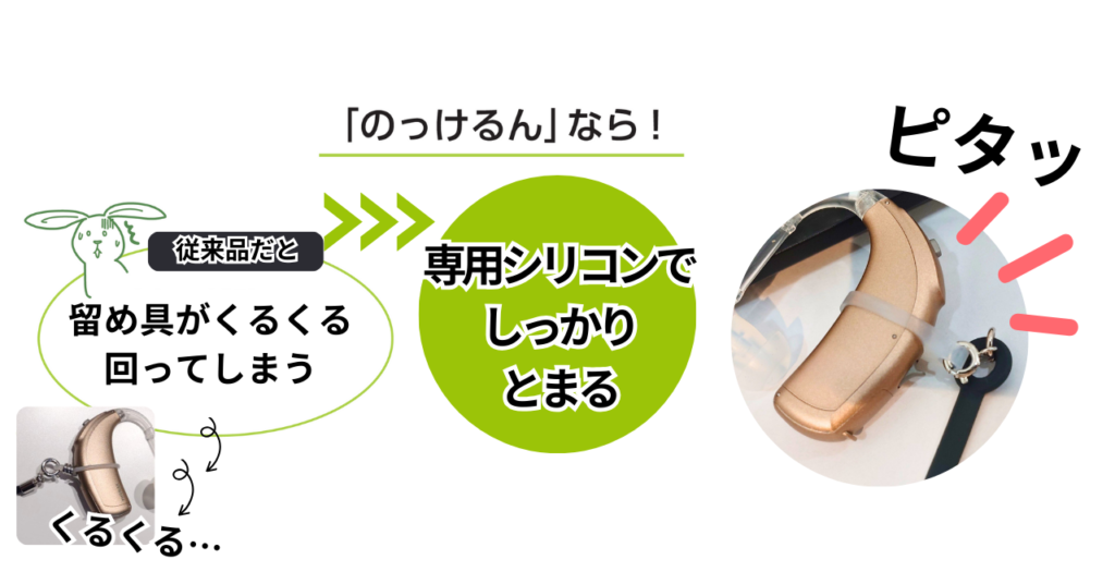 従来品の眼鏡の落下防止ストラップの留め具は、くるくる回って補聴器に固定がしづらいものもありました。「のっけるん」は、ピタっと留まるシリコンパーツを採用しており、補聴器をしっかりホールドするので、滑りにくく使いやすいです。