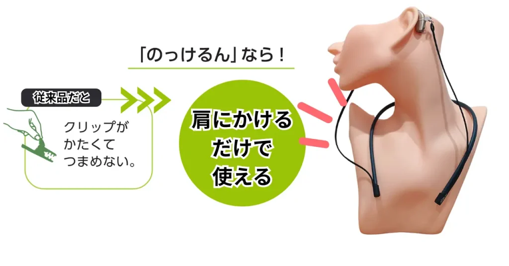 「のっけるん」は、補聴器ユーザーの声から生まれた実用的なアイテムです。ユーザーの声を一番近くで聞いてきた「補聴器のプロ」として、のっけるんの設計にはかなりこだわりました。