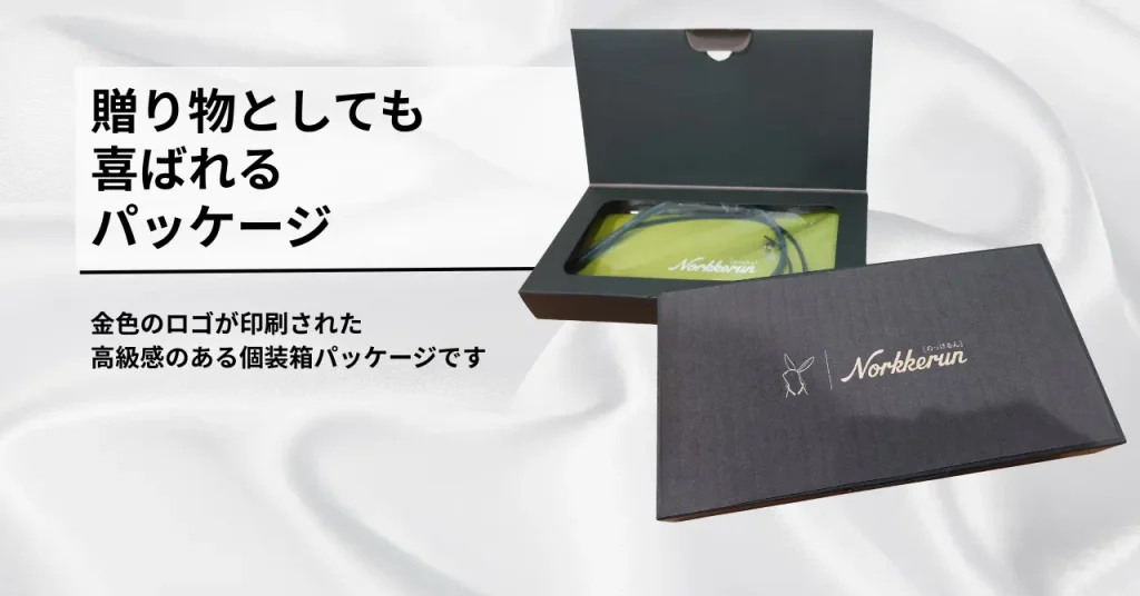 パッケージには『のっけるん』の英語ロゴを金色で刻印し、上質感のある仕上がりを実現しました。ご本人の購入はもちろん、ギフトとしても最適な仕様です。
