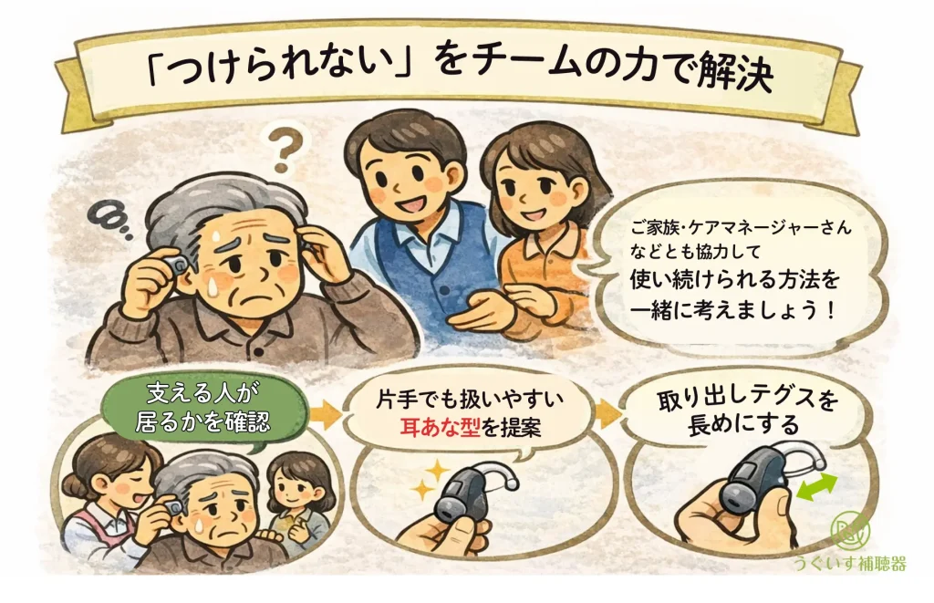 例えば、ご自身の手で耳に装着するのが難しい場合。