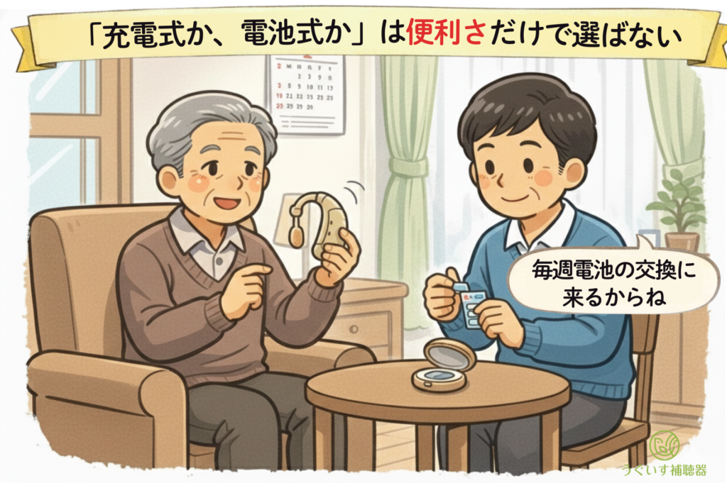 最近は便利な充電式が人気です。小さい電池の交換は高齢者の方にとっては負担なので、多くの方には充電式をおすすめしています。しかし、そうでない提案をした事例もありました。
